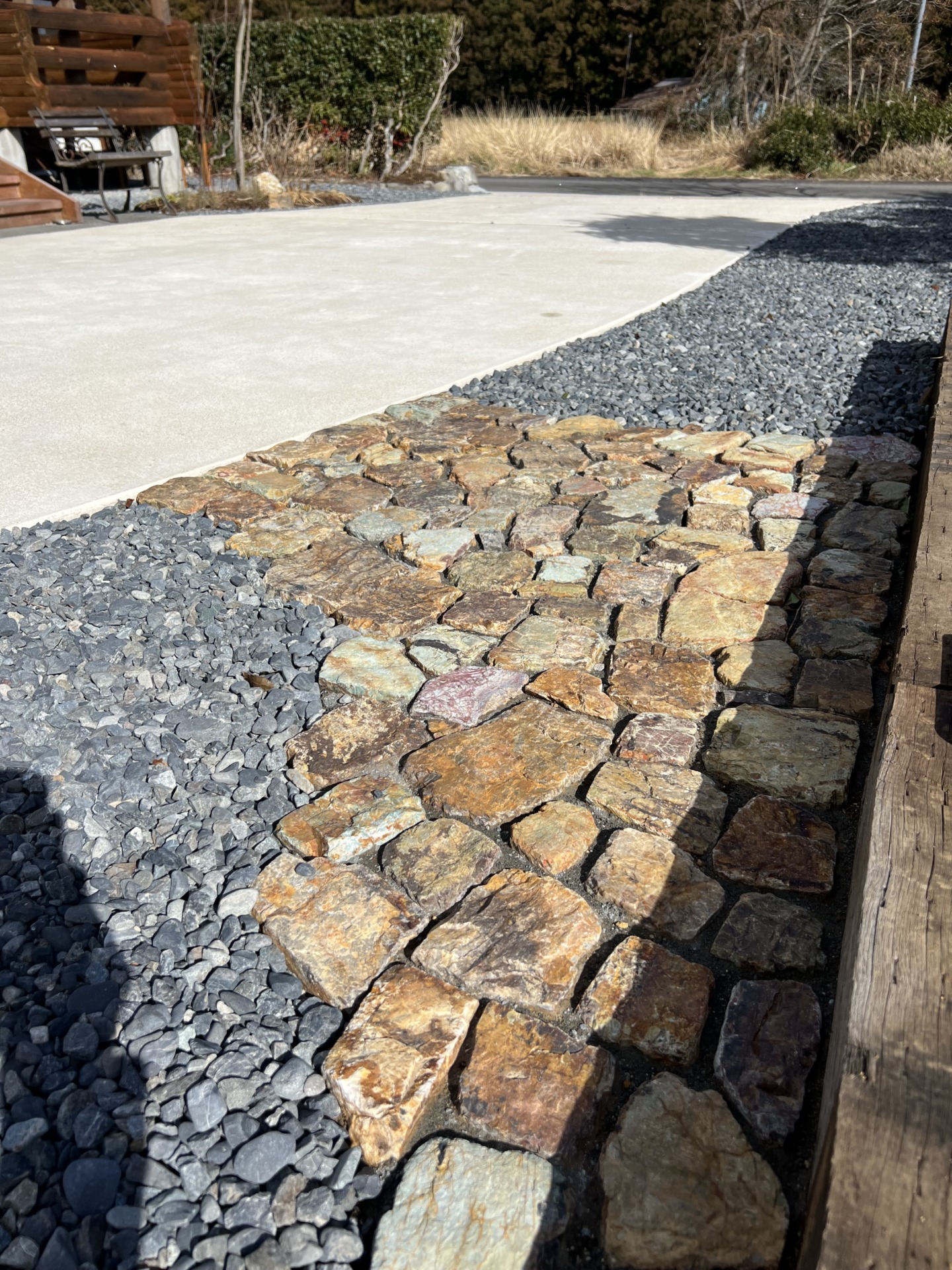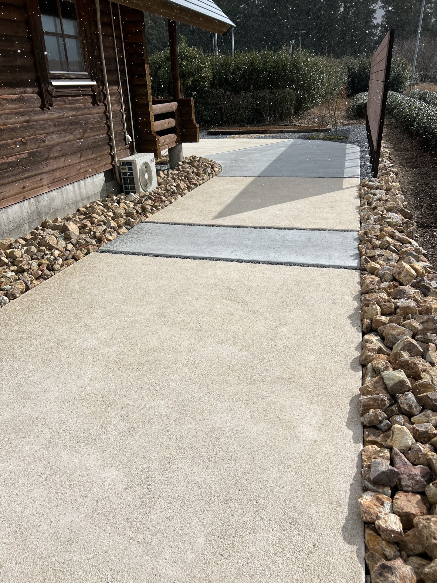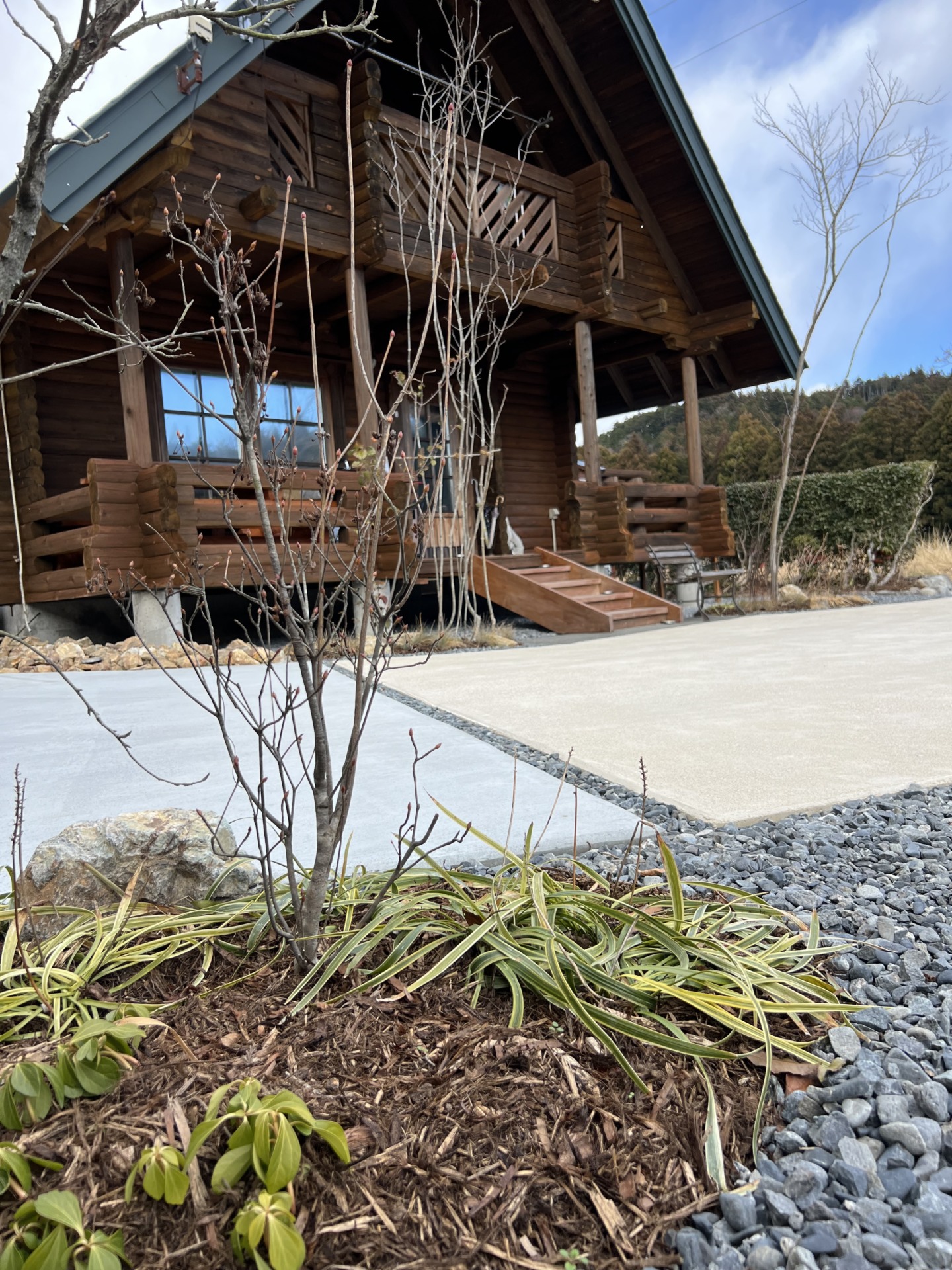 高低差のある乗り入れを周りと馴染む様に色味の違う御影の板石を使い敷き ログハウスに馴染むようにたたき風洗い出しでアプローチ 玄関前を彩るように山取りのイロハモミジやアオダモなど植栽 建築と周辺の自然が調和する庭