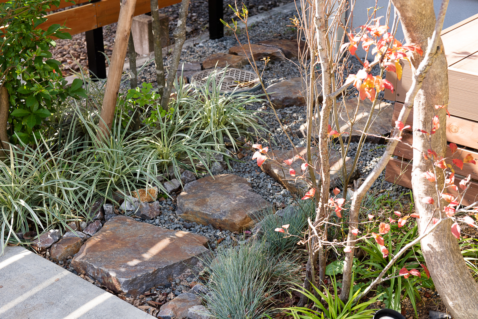 家との調和、木陰を意識して作庭。土壌改良も行い持続的にいい環境が続くよう施工しました。