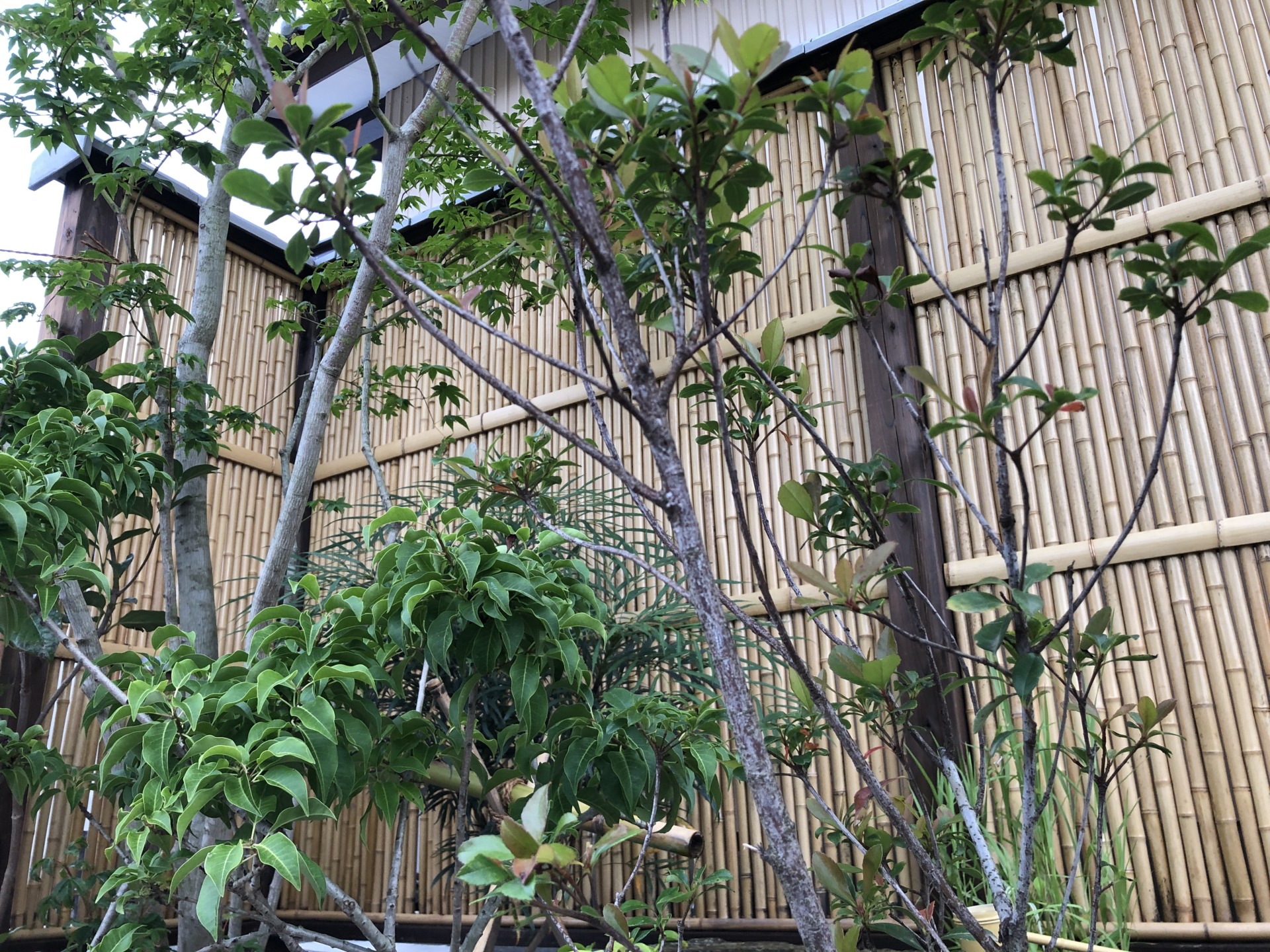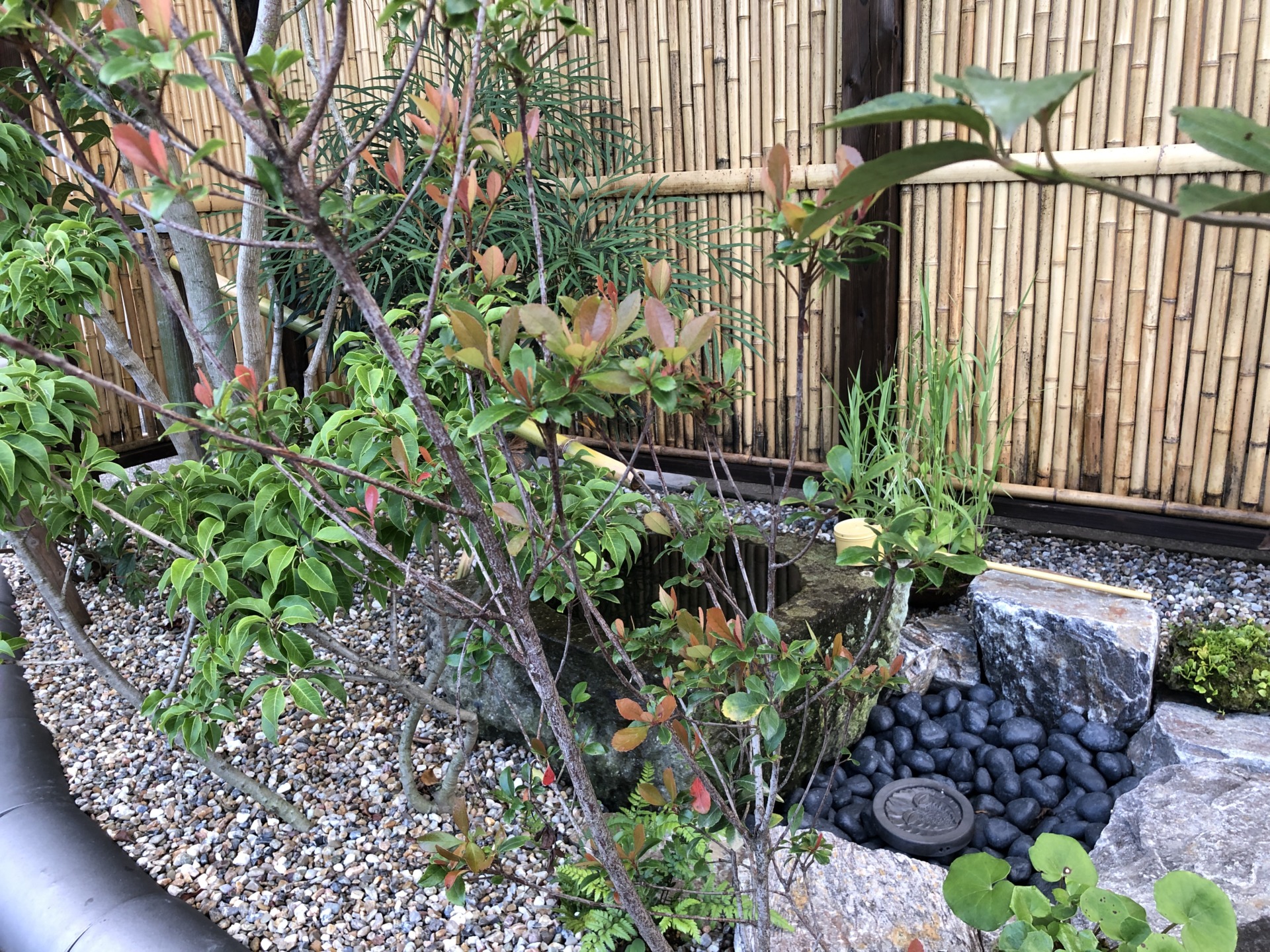 蹲のある庭 雑木のやわらかさとしまりのある竹垣と瓦屋根 バランスに気をつけ安らぐ庭へ