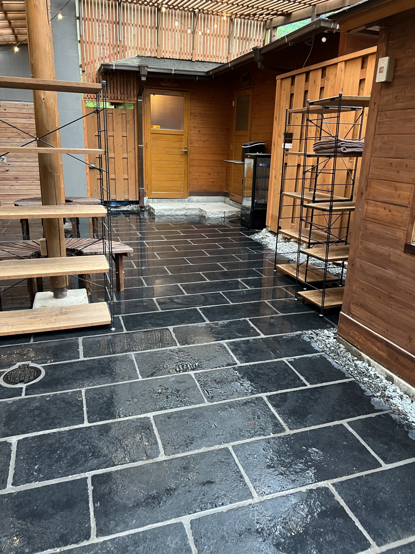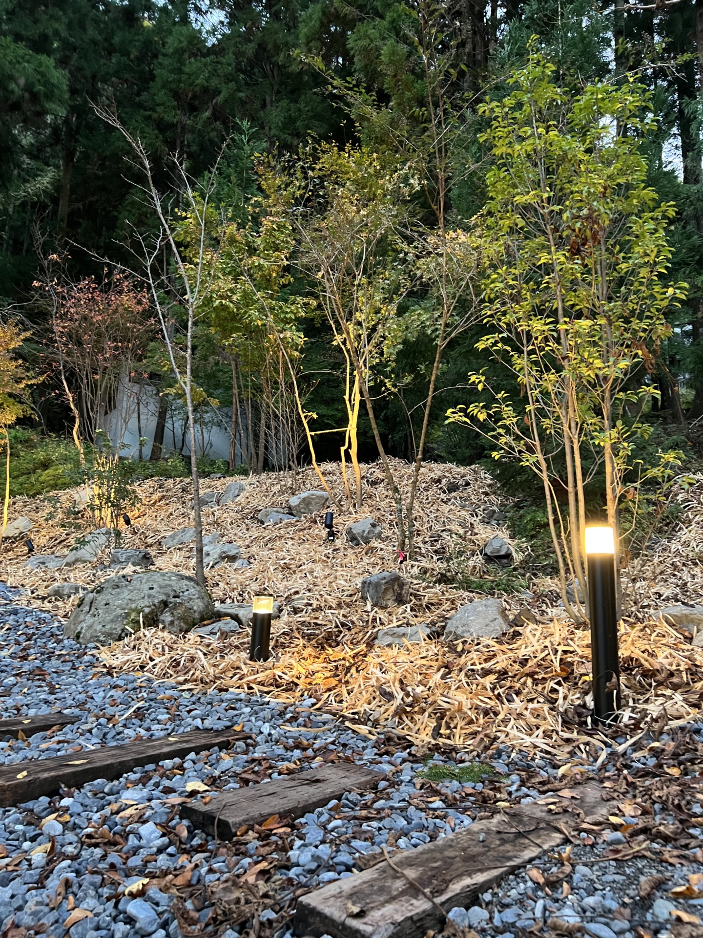 静岡県本川根町にある秘境寸又峡 バレルサウナを包み込むように植栽とアプローチ 出てきた石を据えて元々あったかのような空間に